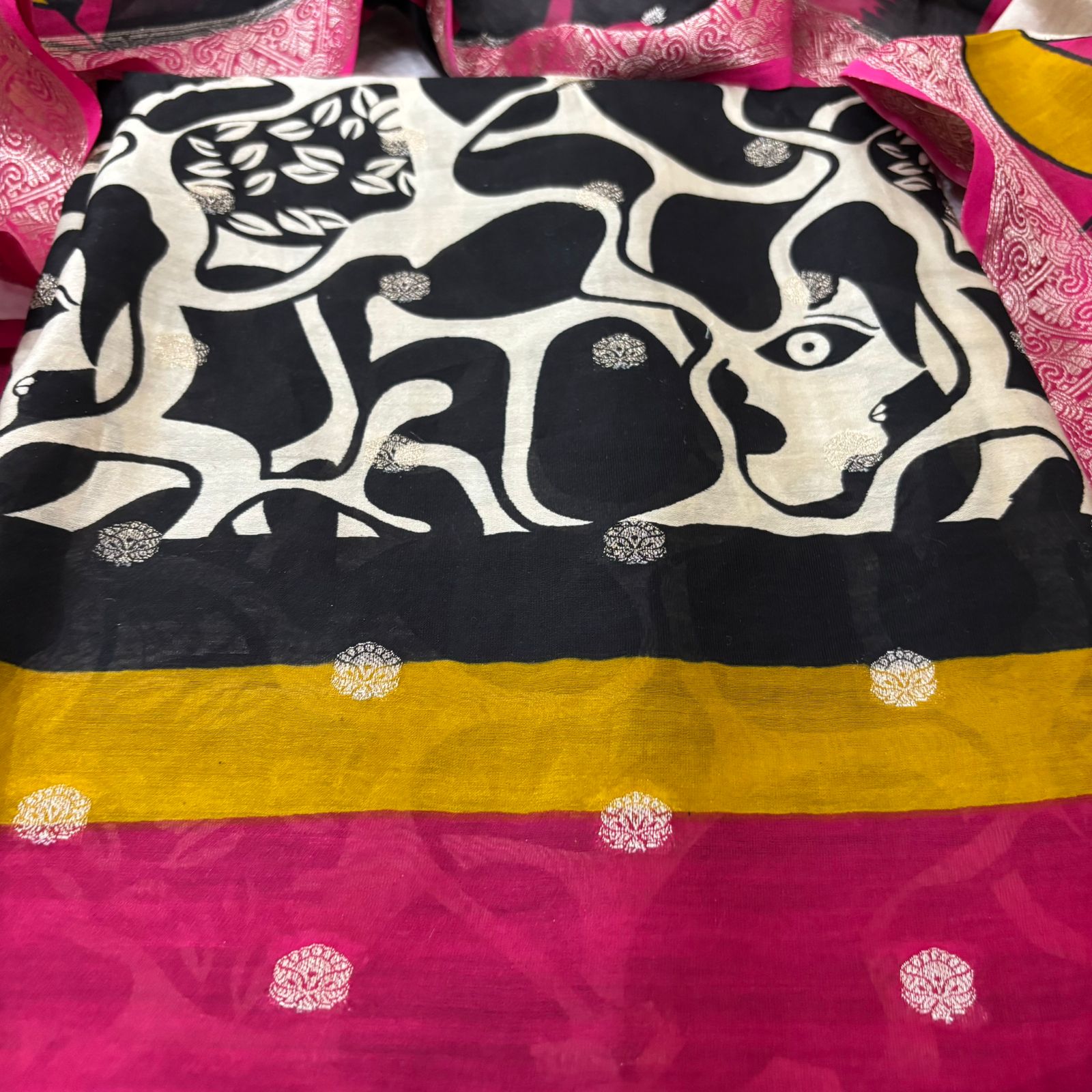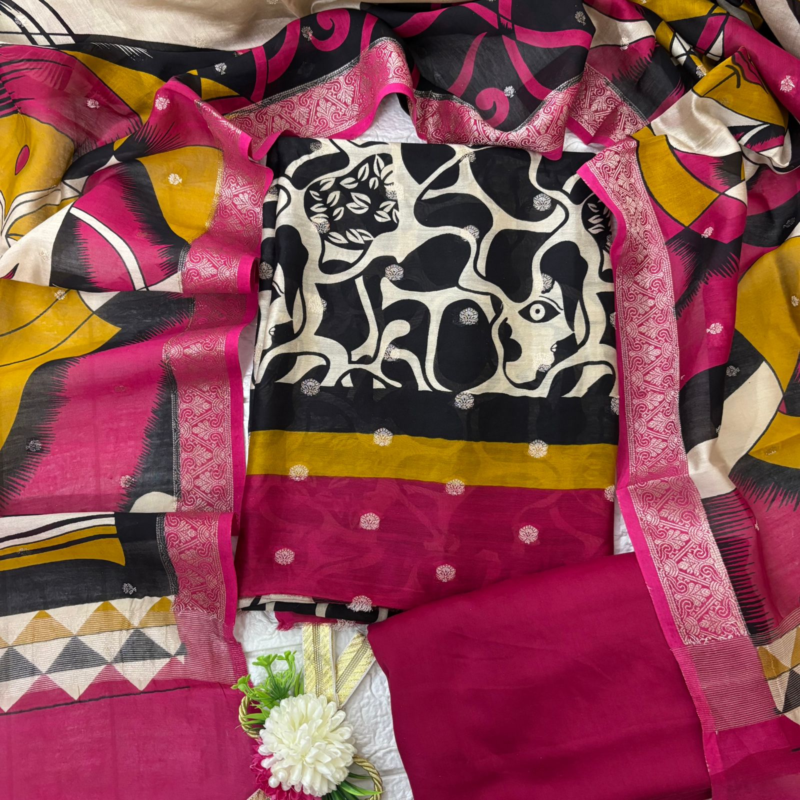 Make a bold statement with this artistic print fabric set, featuring a striking mix of black, pink, and yellow. The dupatta showcases a beautiful blend of geometric patterns and abstract designs, with contrasting hues and intricate borders that add an edgy yet sophisticated feel. The shirt piece, with its unique black and cream print featuring abstract shapes, stands out with its artistic design. A matching pink fabric piece completes the set, creating a vibrant and modern ensemble perfect for any occasion where you want to make a lasting impression.