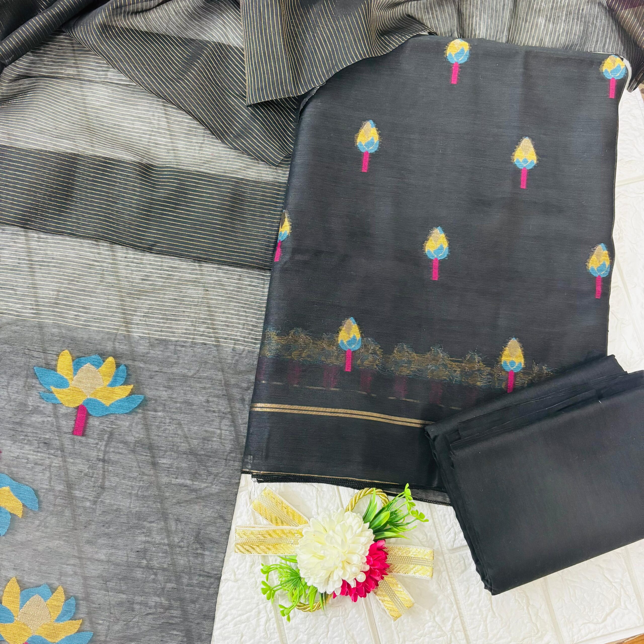 Graceful black unstitched suit set with colorful floral motifs, paired with a striped dupatta and plain bottom — perfect for elegant festive wear.