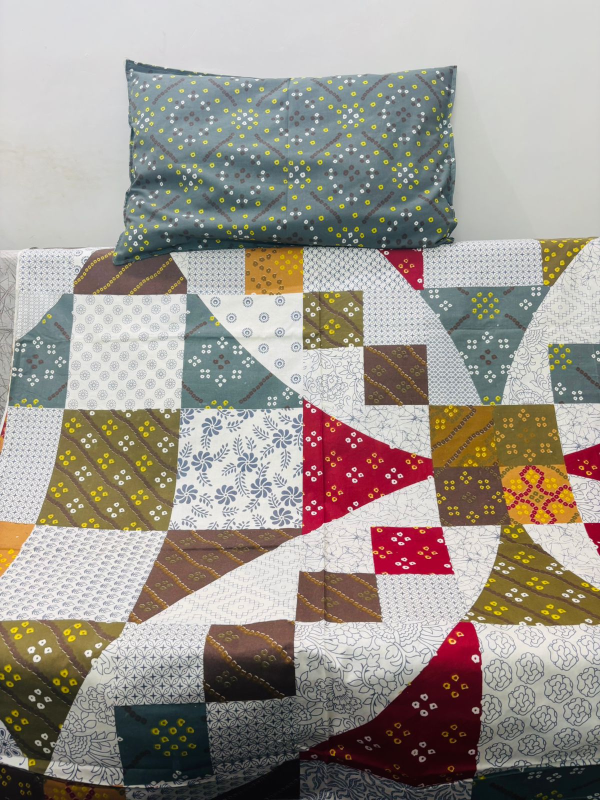 Infuse your bedroom with vibrant charm and artistic flair with this contemporary patchwork-style bedsheet set. Featuring a bold mix of geometric and floral prints in earthy reds, yellows, greys, and whites, this design delivers a modern twist to traditional aesthetics—perfect for those who love eclectic, colorful décor.