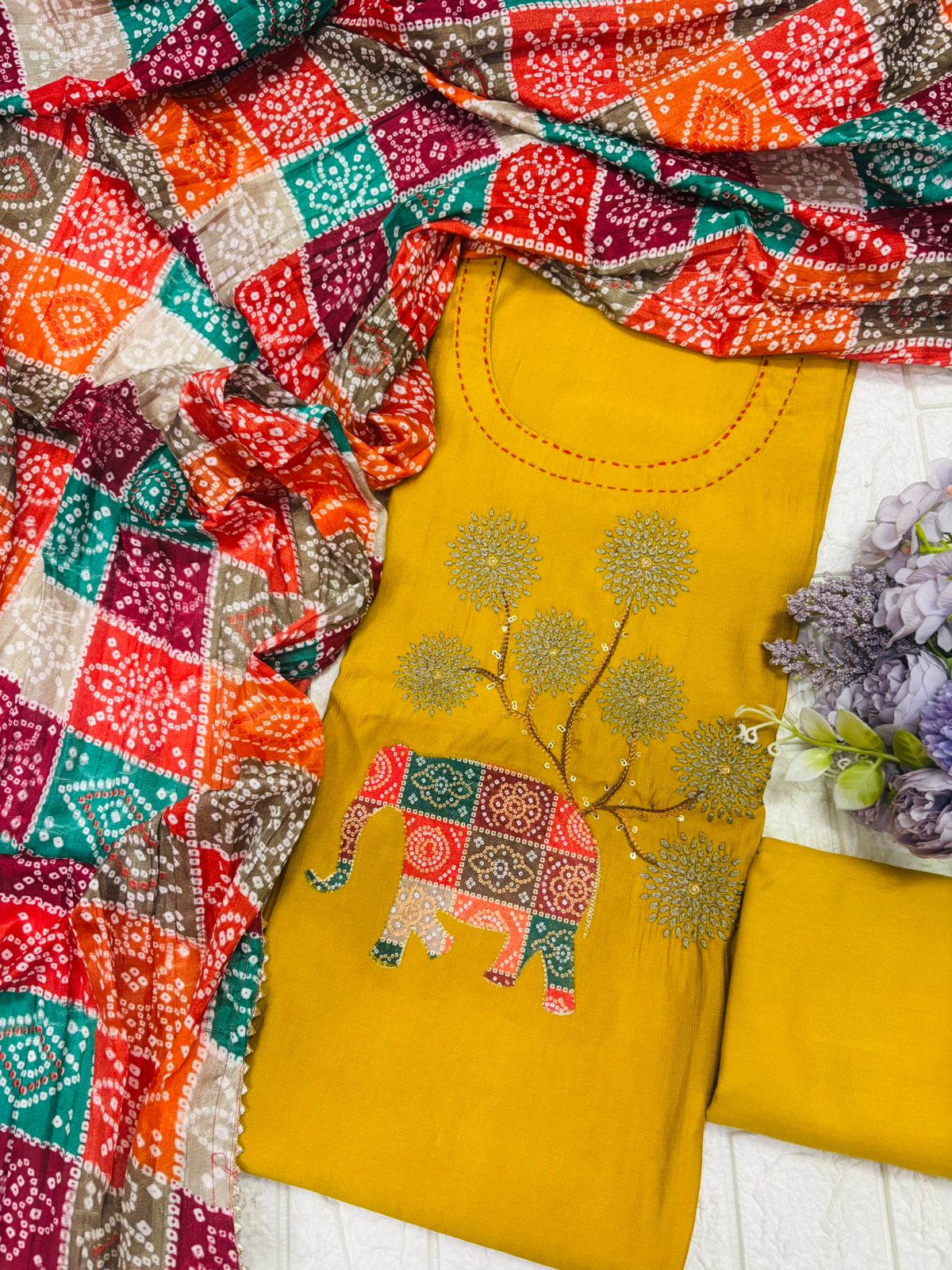 Add timeless charm to your wardrobe with this beautifully crafted unstitched suit set. The classic kurta fabric features intricate elephant and floral embroidery with delicate mirror and thread detailing, giving it a rich ethnic appeal. Paired with a vibrant multi-color bandhani print dupatta, this ensemble perfectly blends tradition with contemporary elegance.