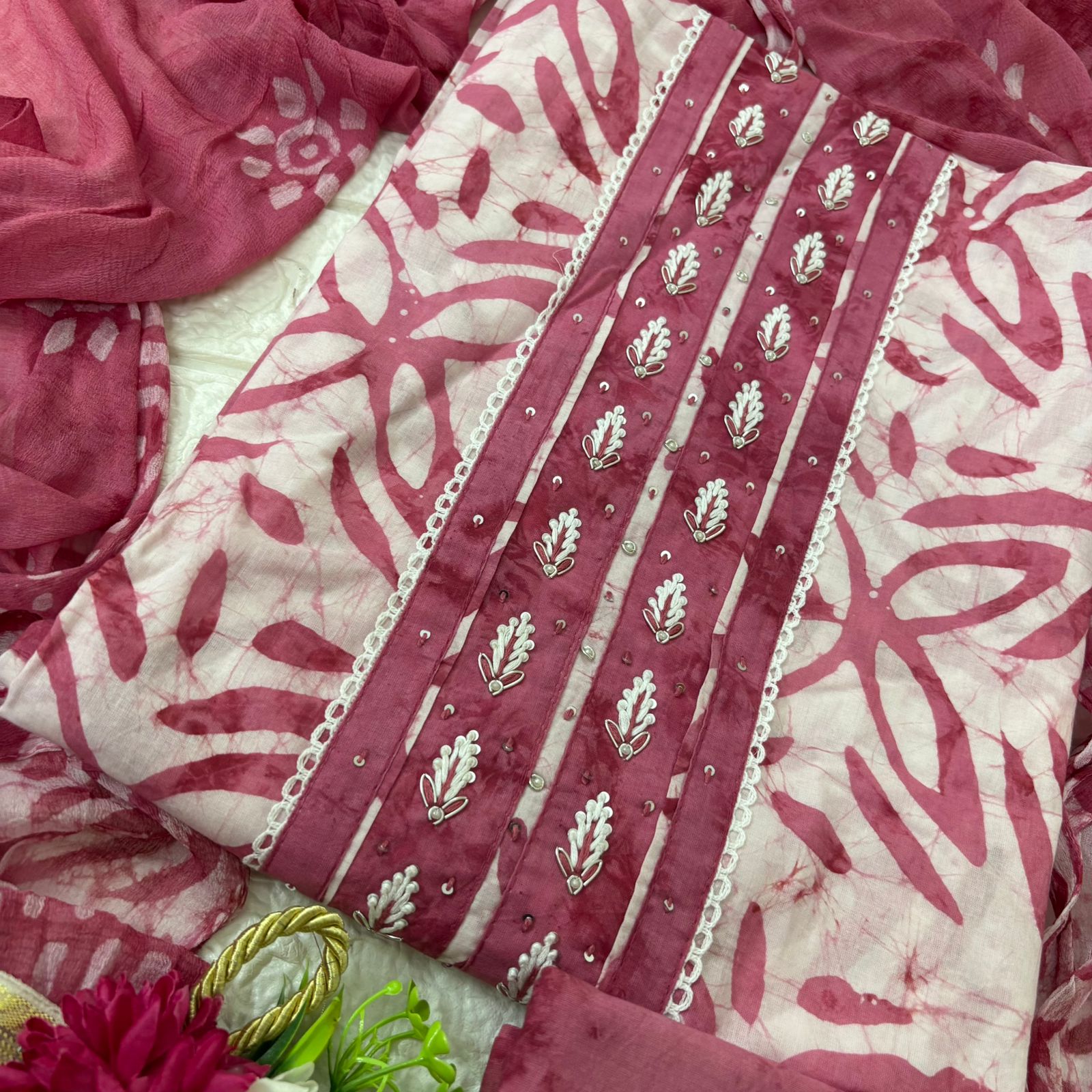 Add timeless elegance to your wardrobe with these beautifully crafted Bandhej suit sets, available in pink and Olive Green. Each suit features a soft fabric base adorned with delicate embroidery on the neckline, paired with a matching Bandhej dupatta and plain bottom. Perfect for festive occasions, family gatherings, or casual wear, these suits blend traditional charm with modern grace.