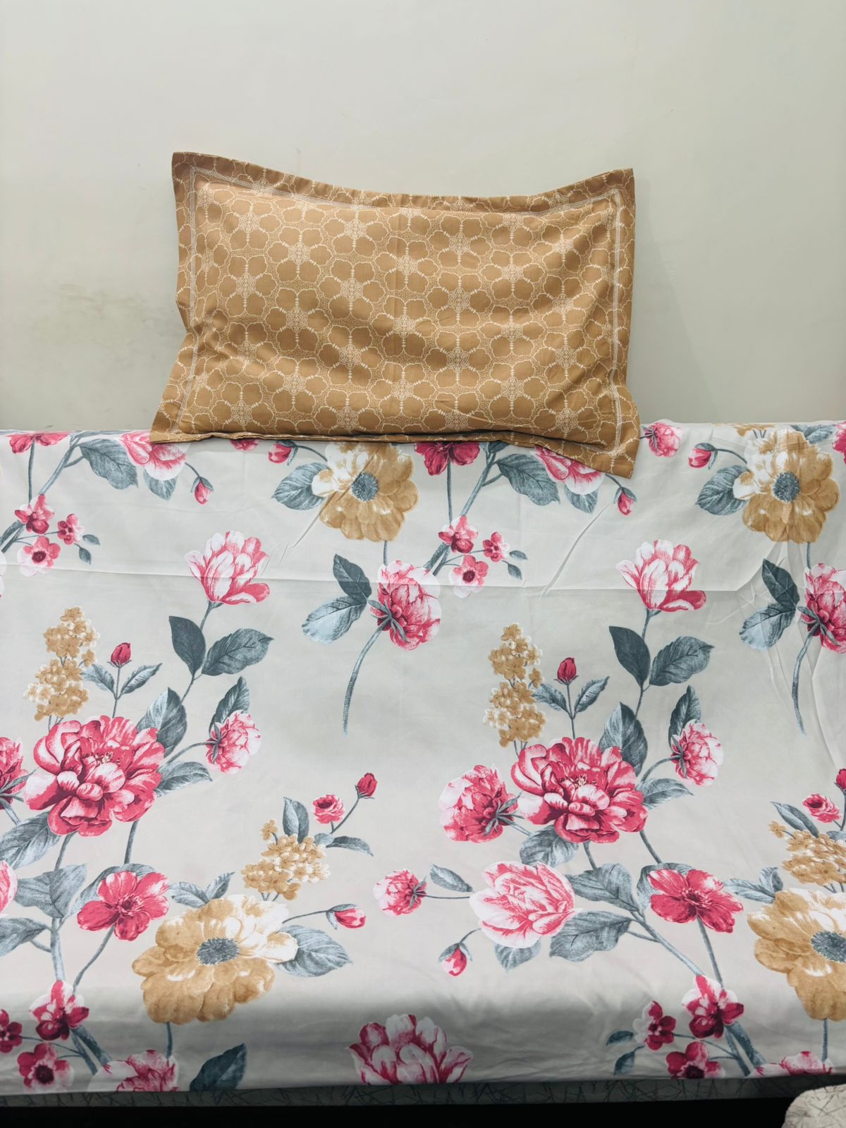 Add a touch of elegance and freshness to your bedroom with this beautiful floral cotton bedsheet. Featuring a charming mix of pink, red, and mustard-yellow floral patterns on a soft cream background, this bedsheet brightens up any room with its graceful design.