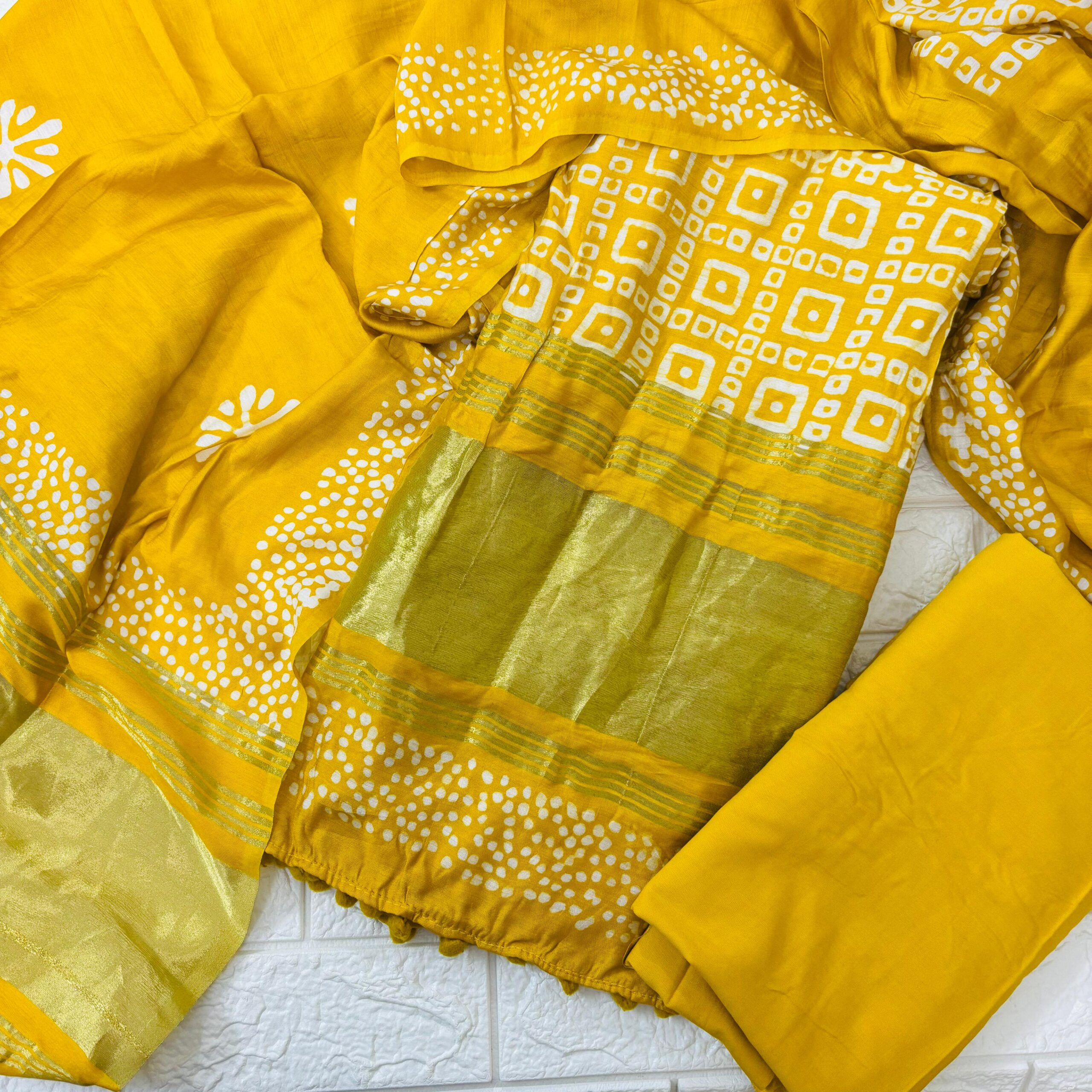 Beautiful Bandhani-inspired suit sets with Zari weaving borders