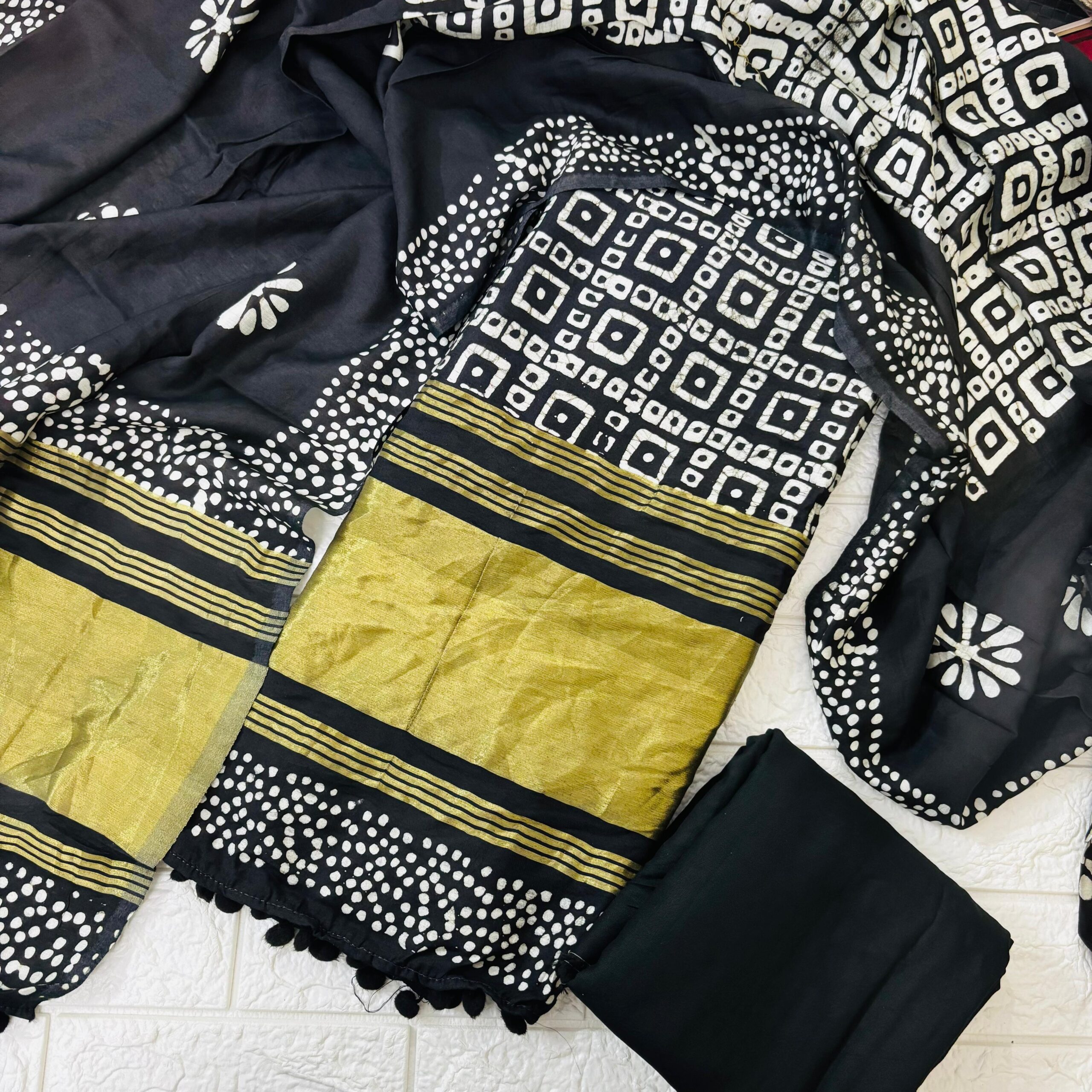 ▪ Bandhani-style white patterns on dupatta & top