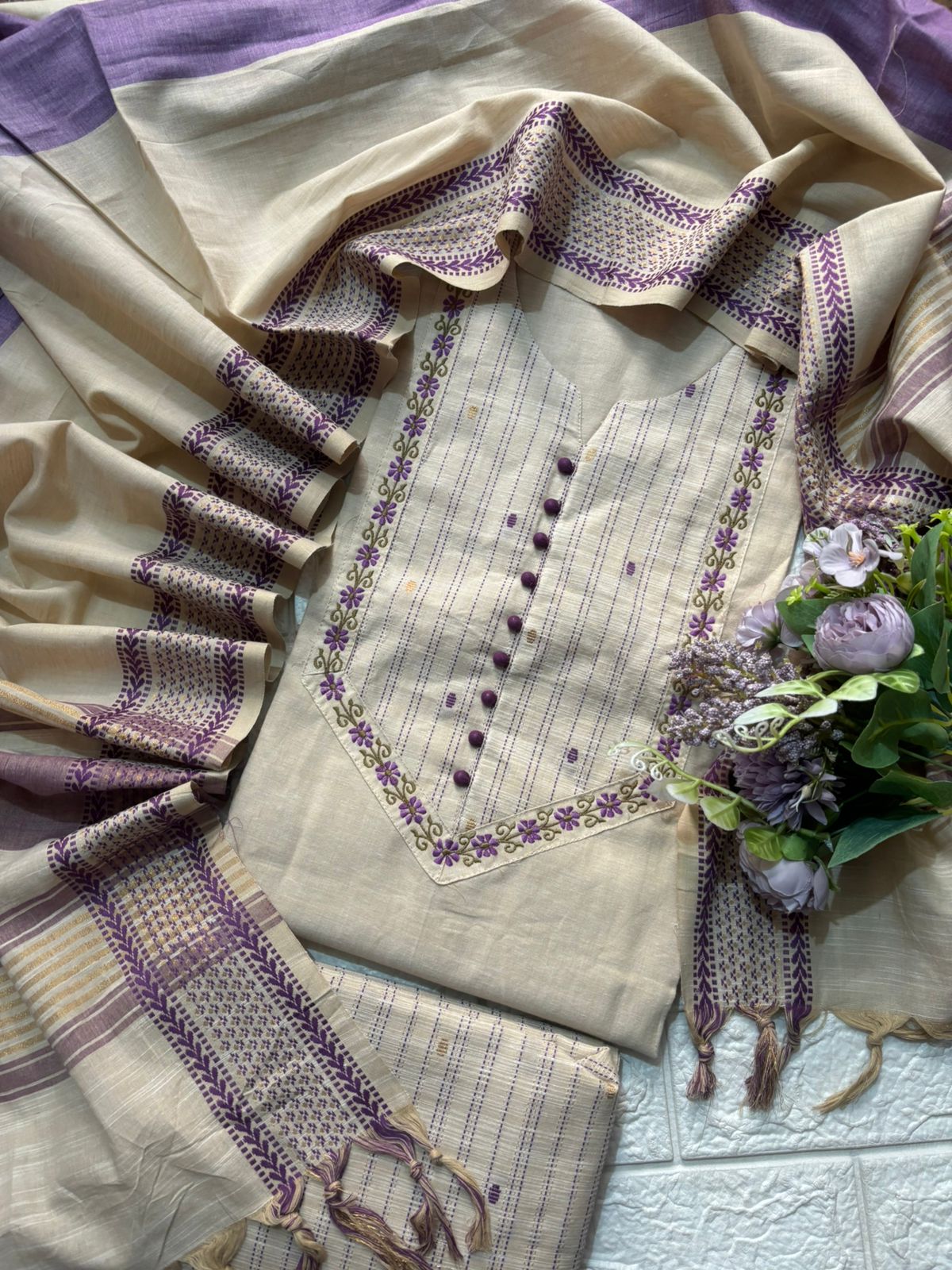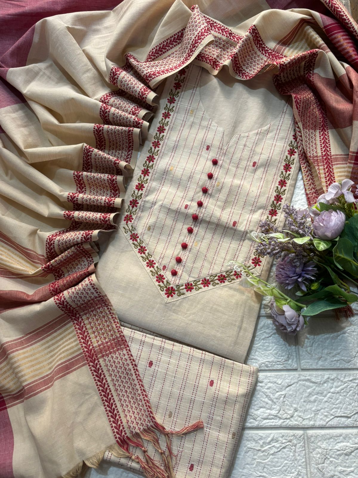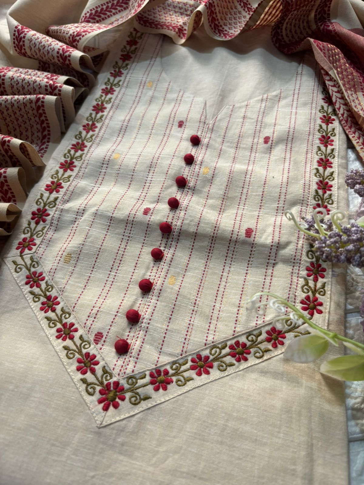 This beautifully crafted suit set features delicate embroidery, fine stripe detailing, and statement buttons, paired with a soft, printed dupatta. Lightweight, breathable, and designed for effortless grace — ideal for daily wear, small gatherings, and festive moments.