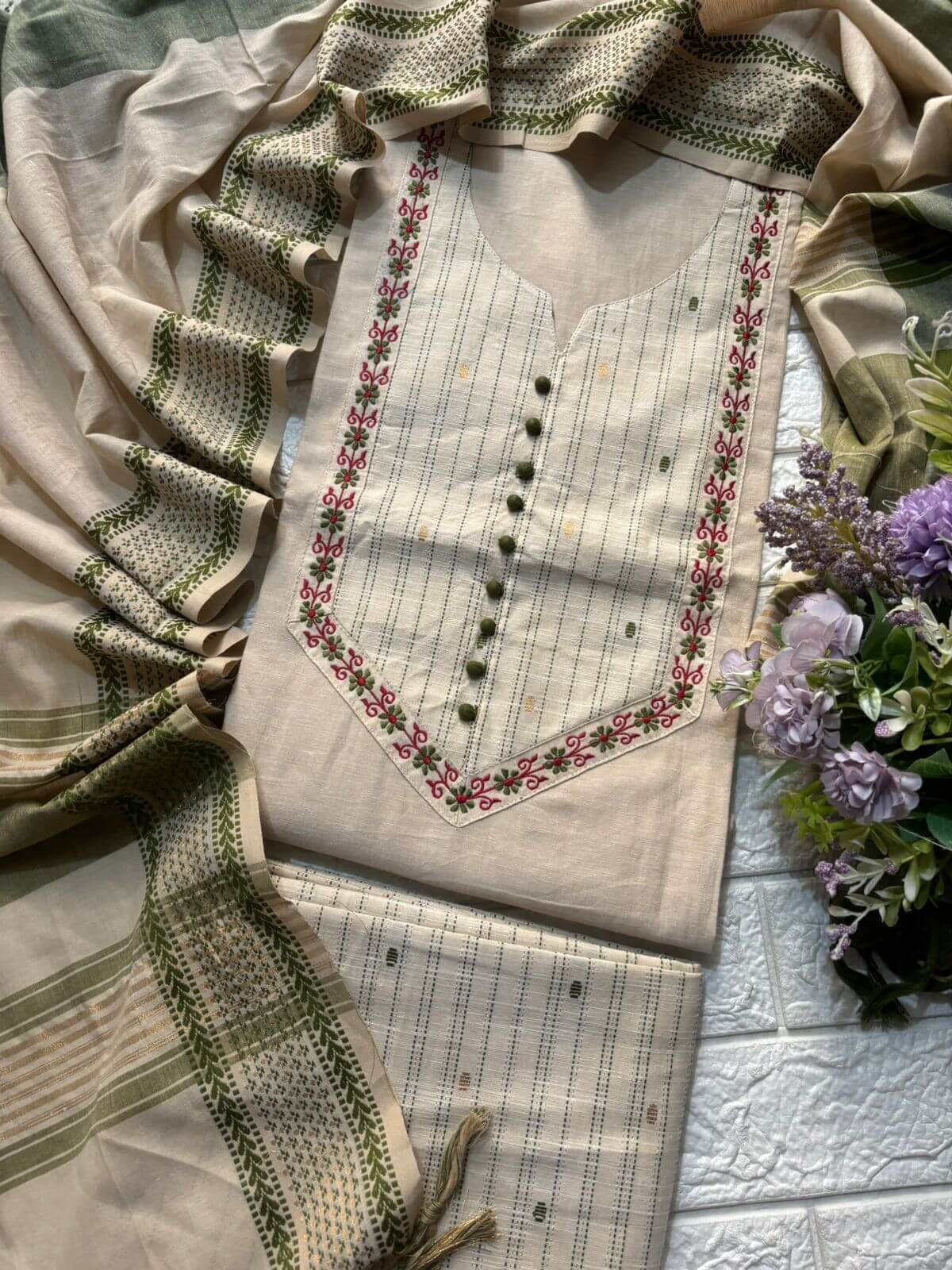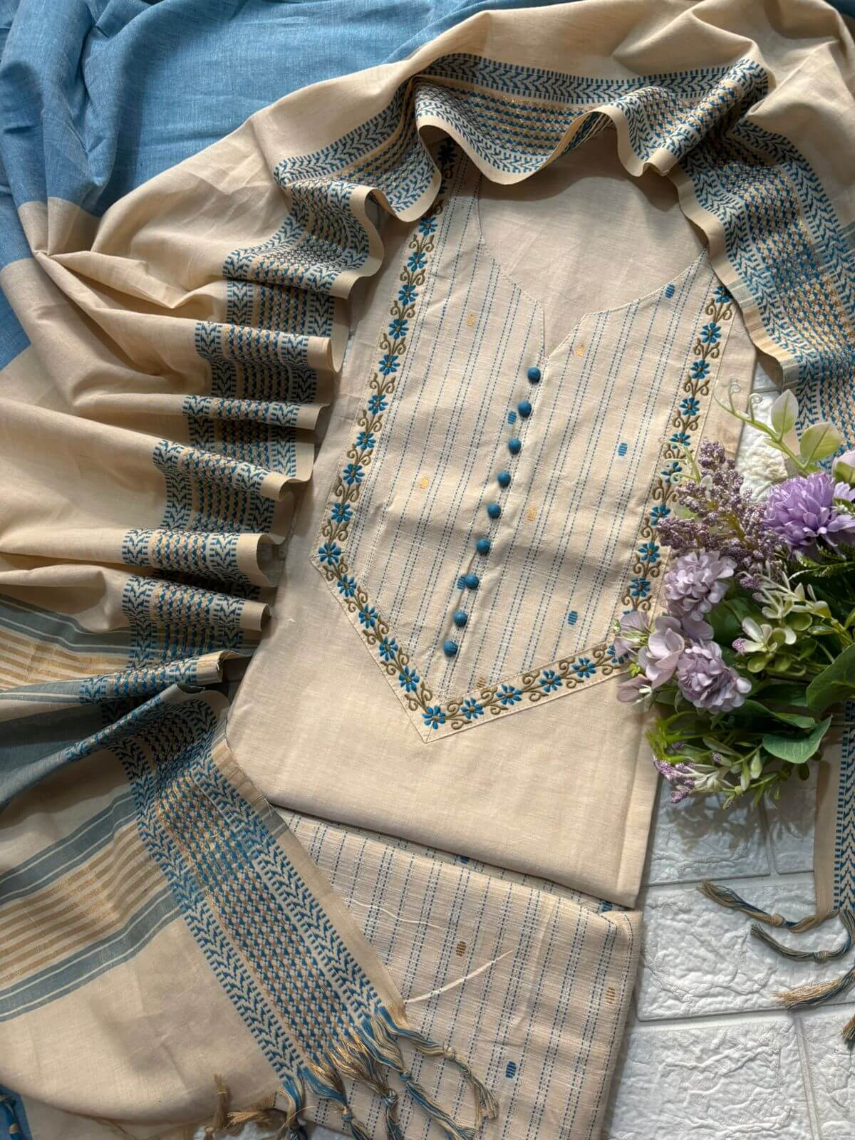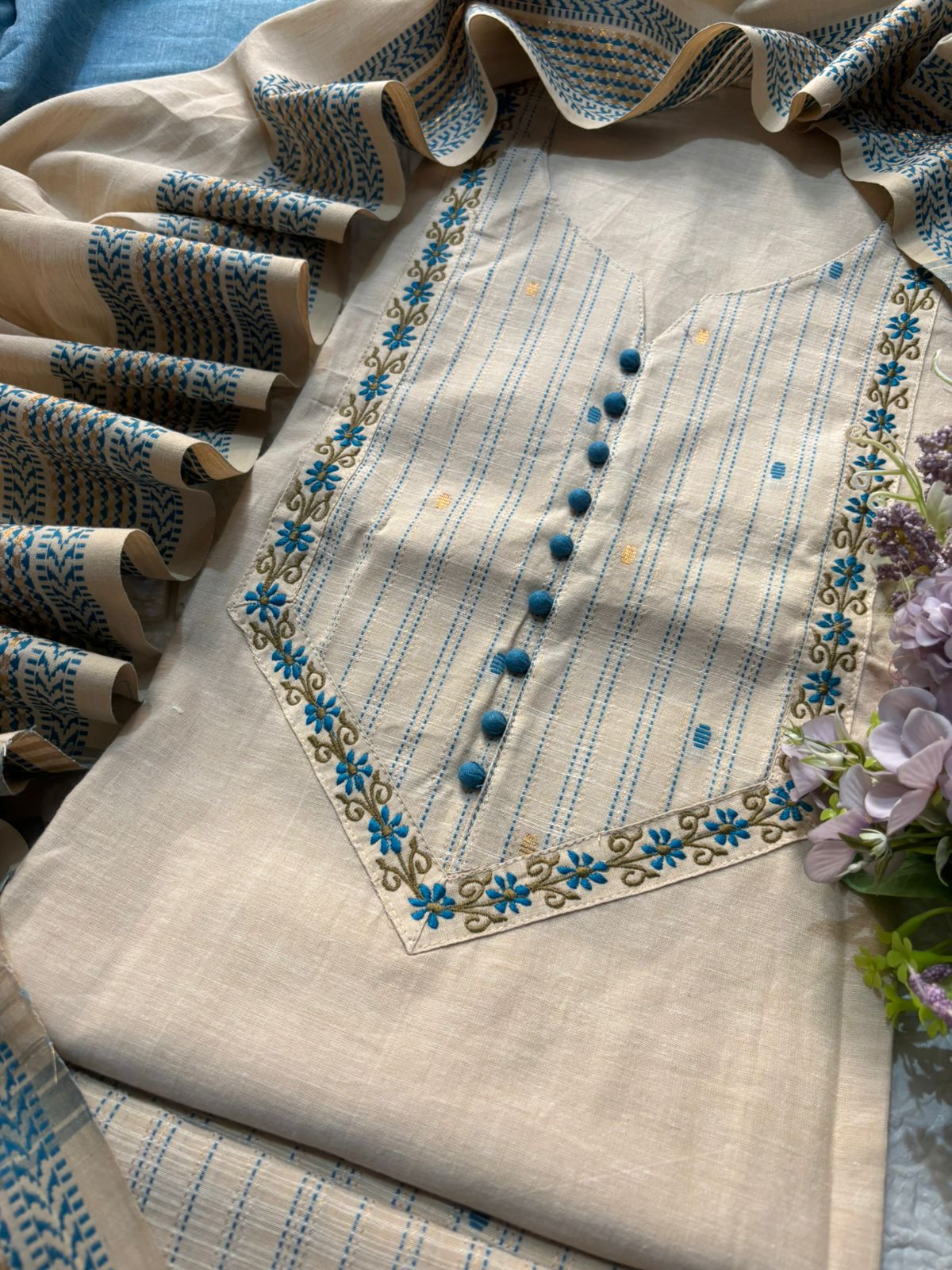 This beautifully crafted suit set features delicate embroidery, fine stripe detailing, and statement buttons, paired with a soft, printed dupatta. Lightweight, breathable, and designed for effortless grace — ideal for daily wear, small gatherings, and festive moments.