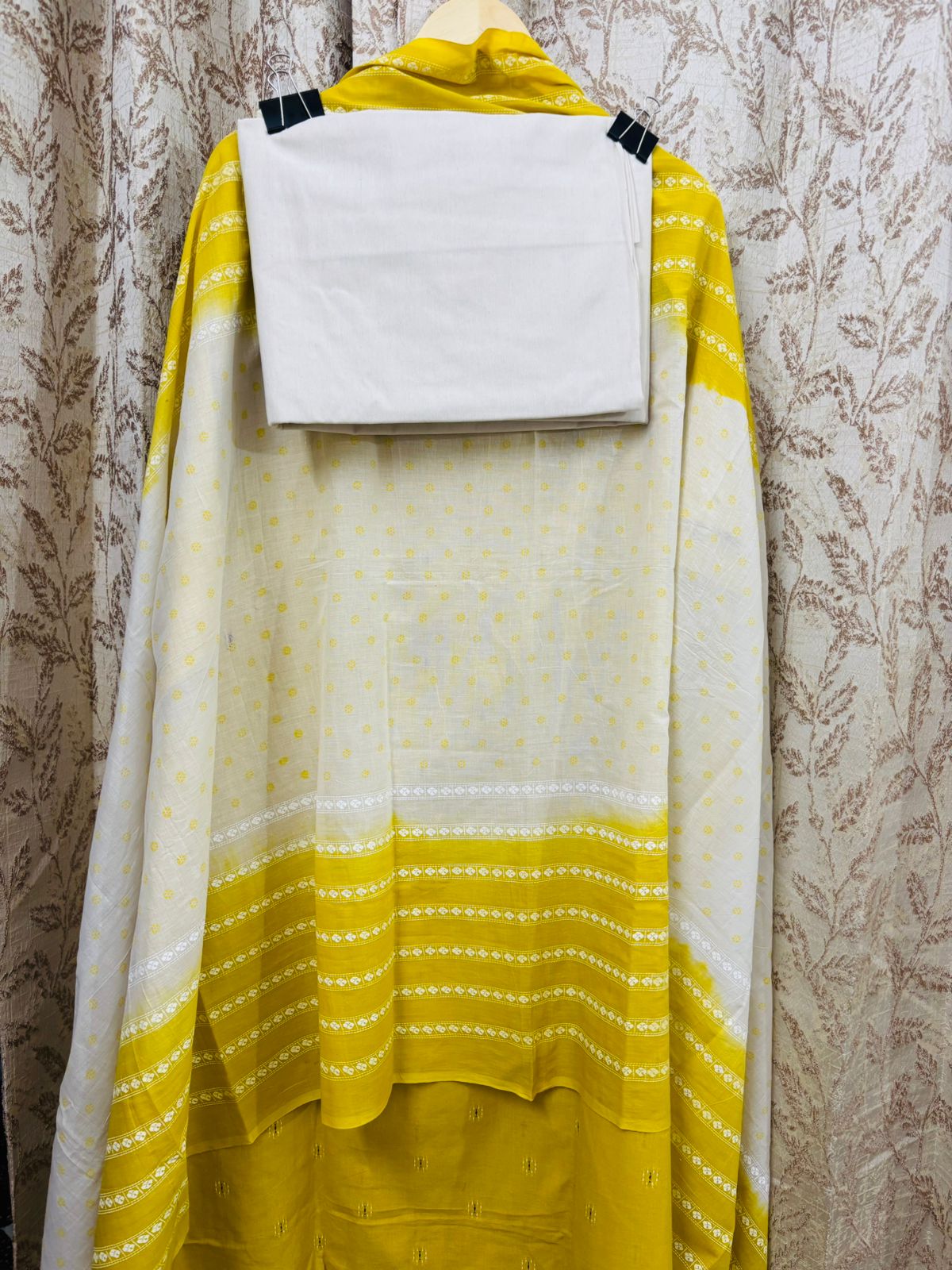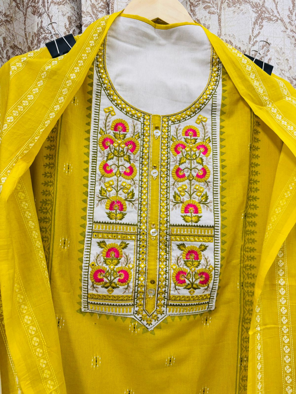 Bright and festive unstitched suit featuring intricate front embroidery in pink and white, paired with a matching yellow and white dupatta. Ideal for traditional and semi-formal occasions.