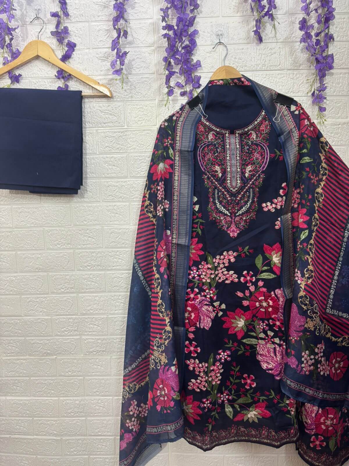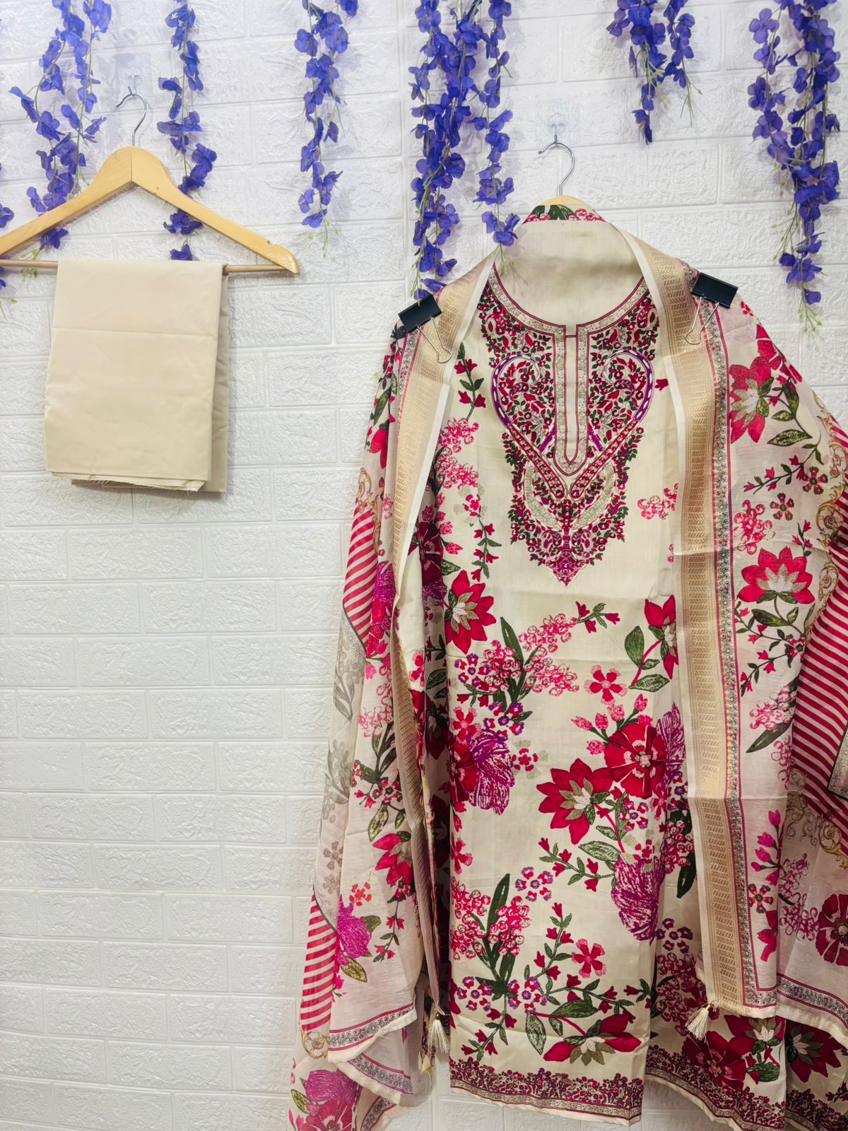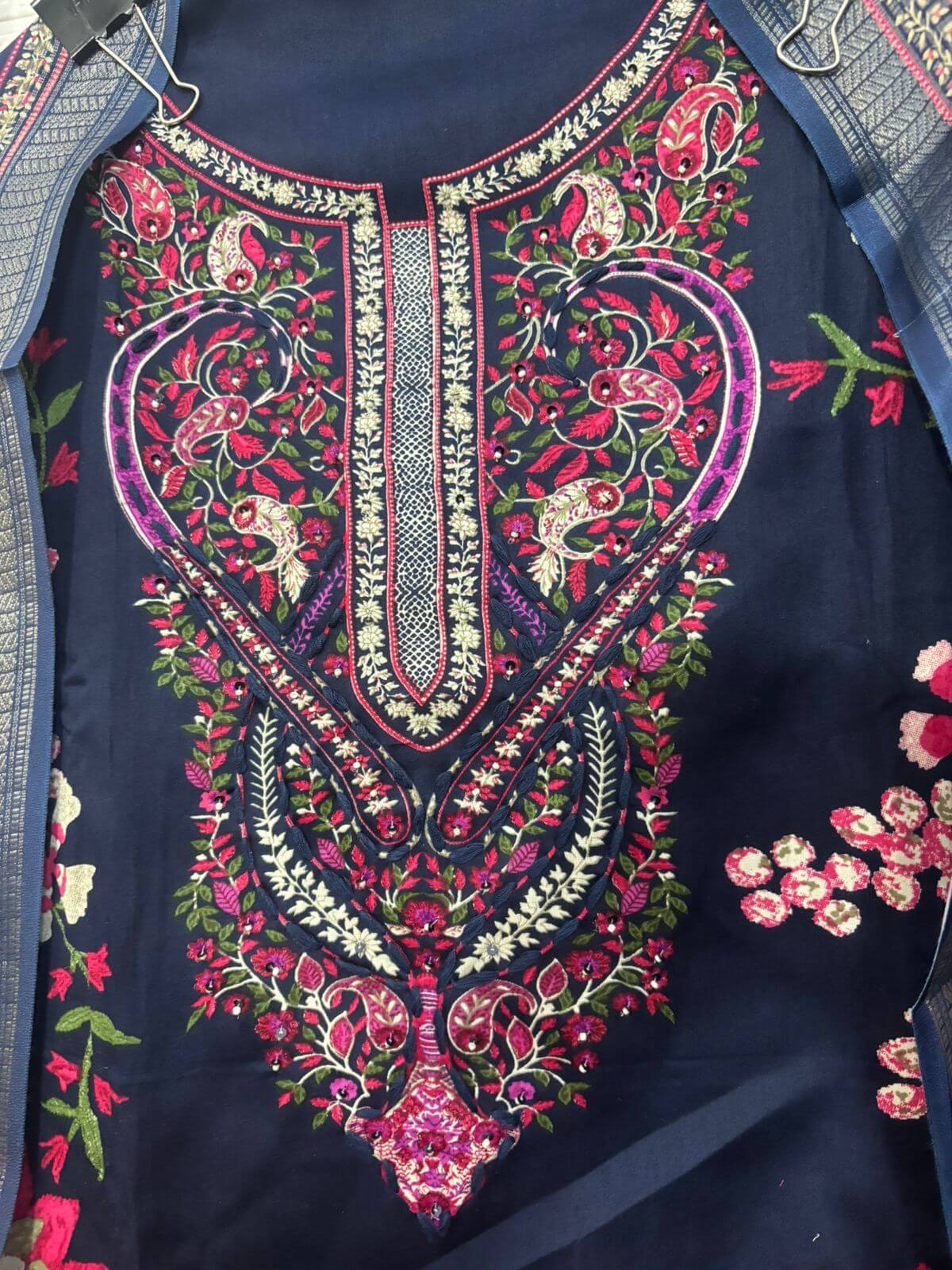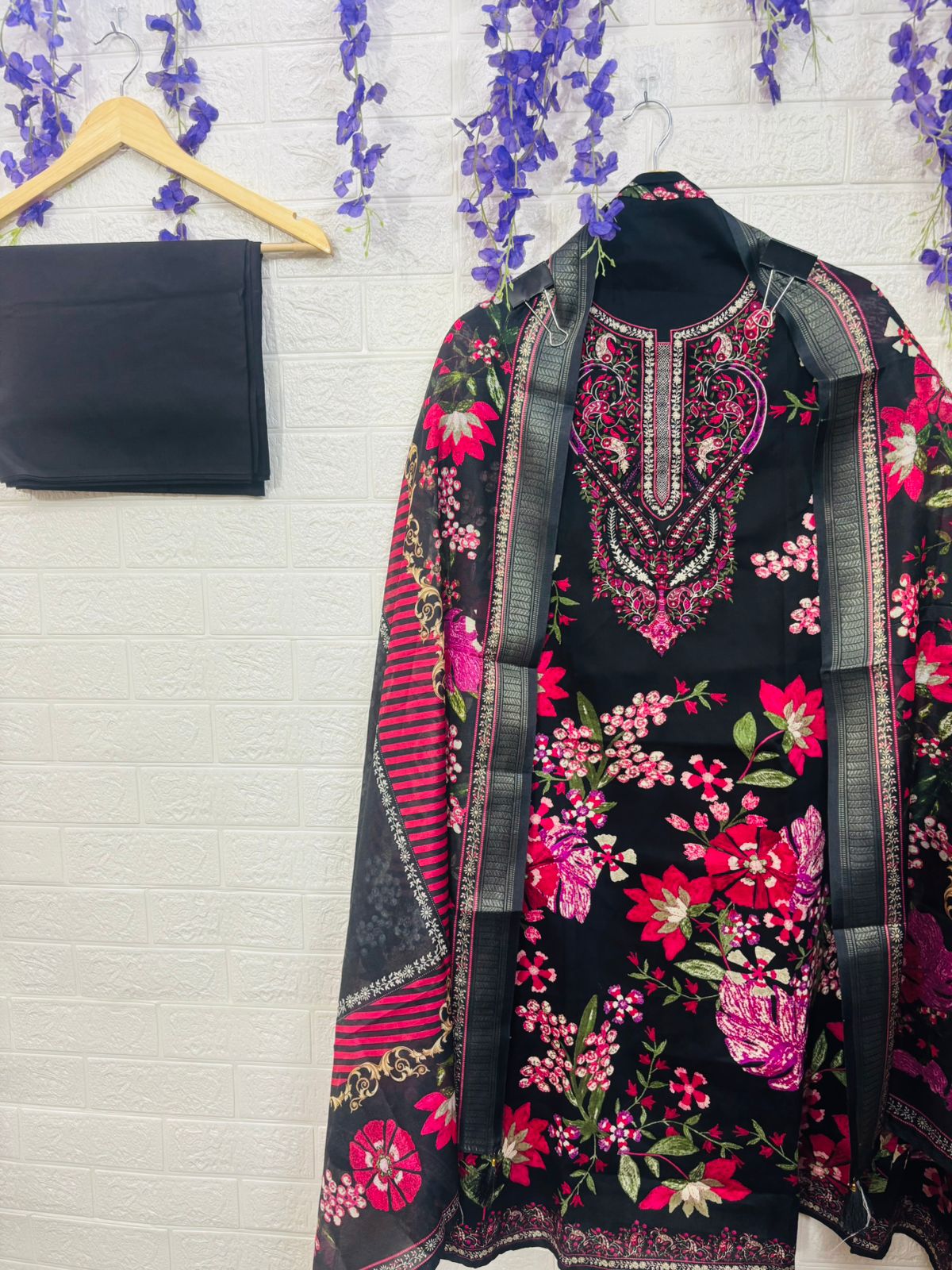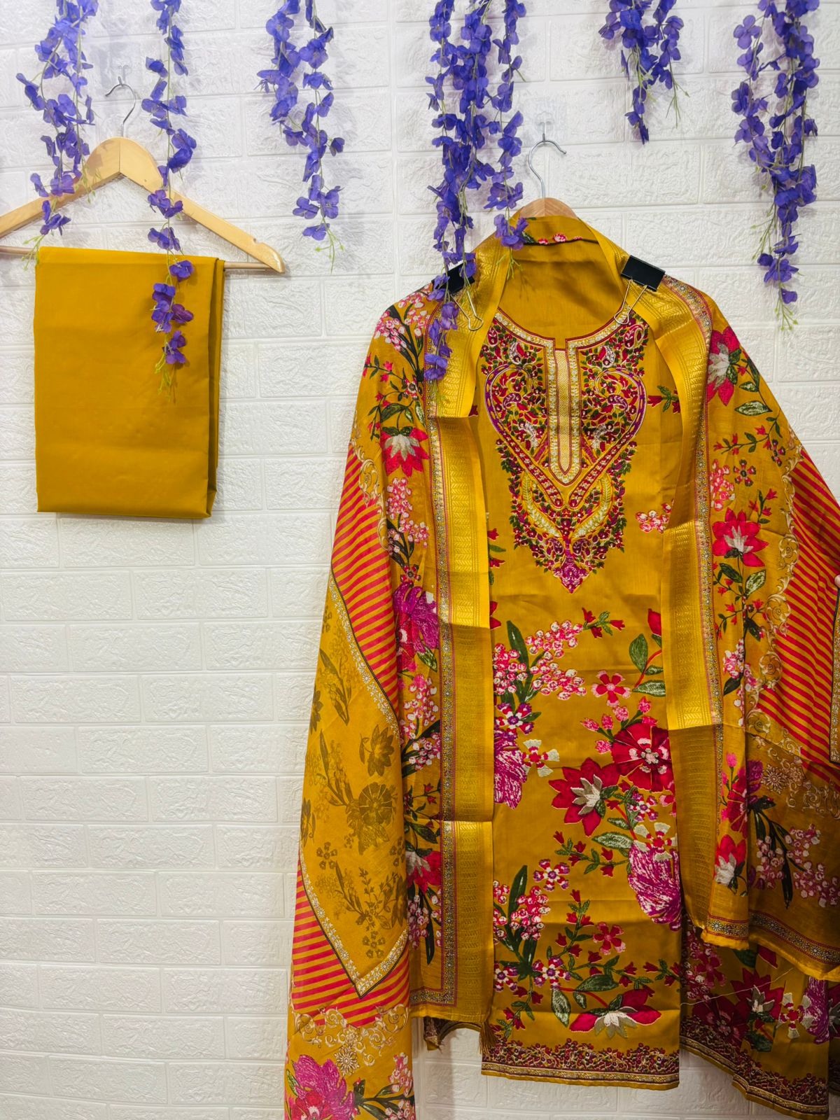 A beautifully designed suit set featuring intricate neckline embroidery and vibrant floral prints, paired with a complementing dupatta. Lightweight, classy, and perfect for festive occasions, day outings, and elegant everyday wear.