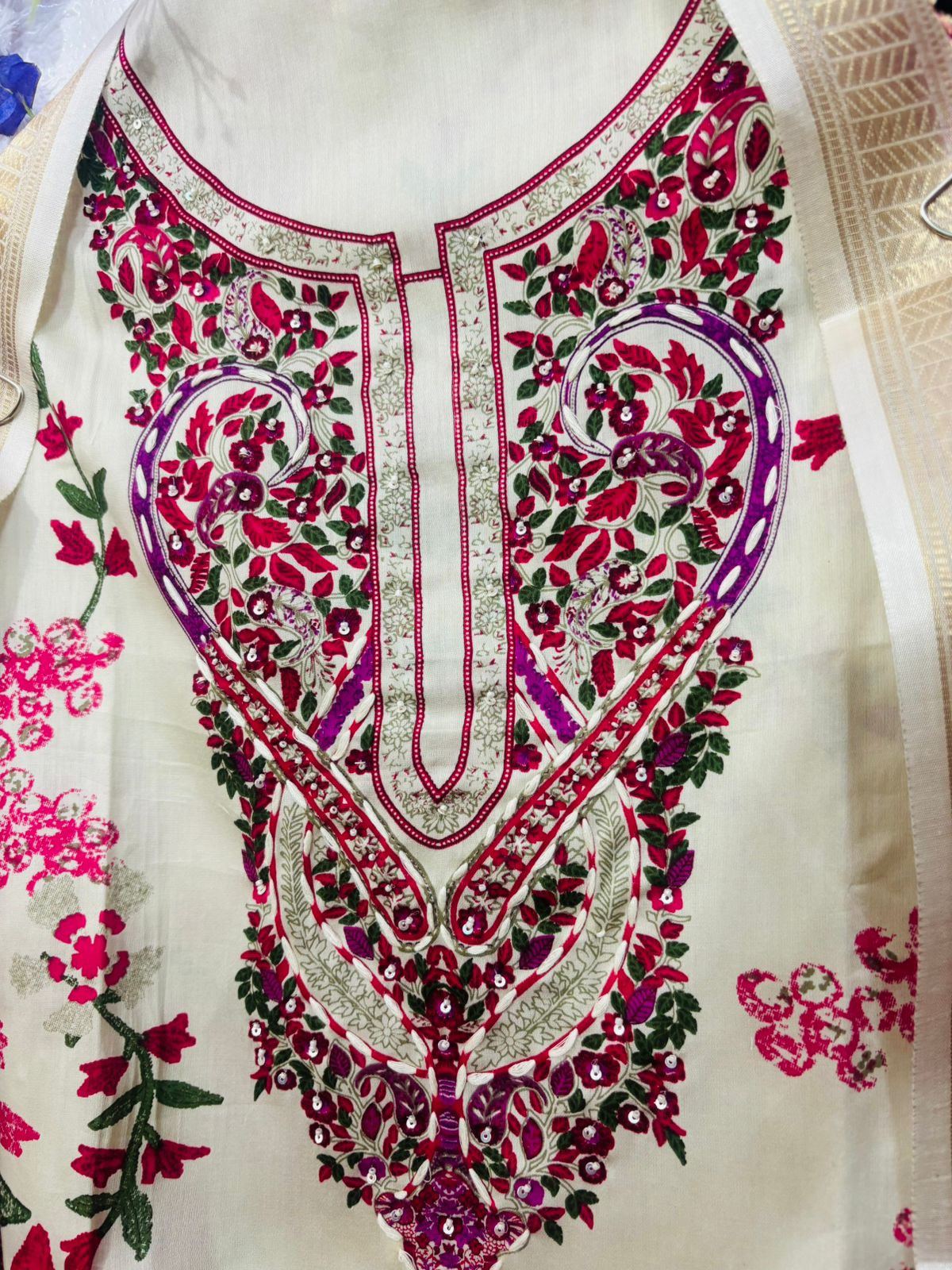 Highlighted thread neck jaam cotton pakistani print suit with Chanderi dupatta