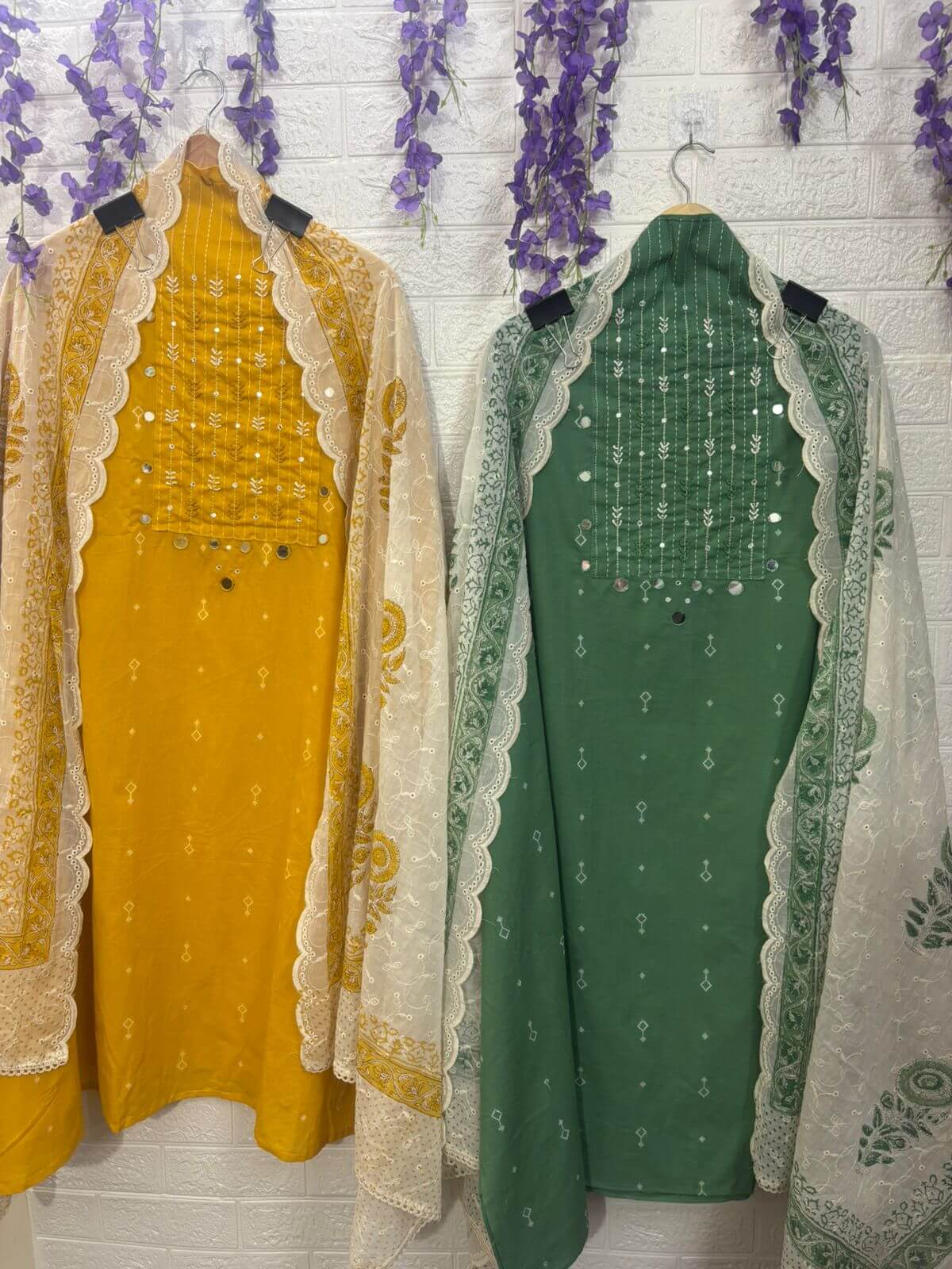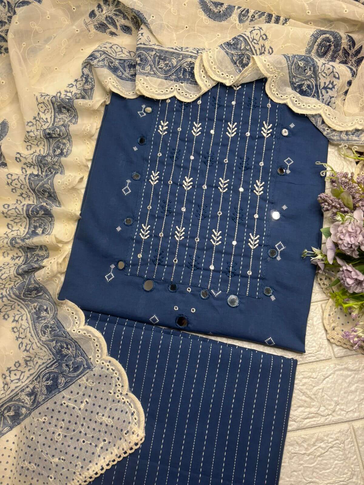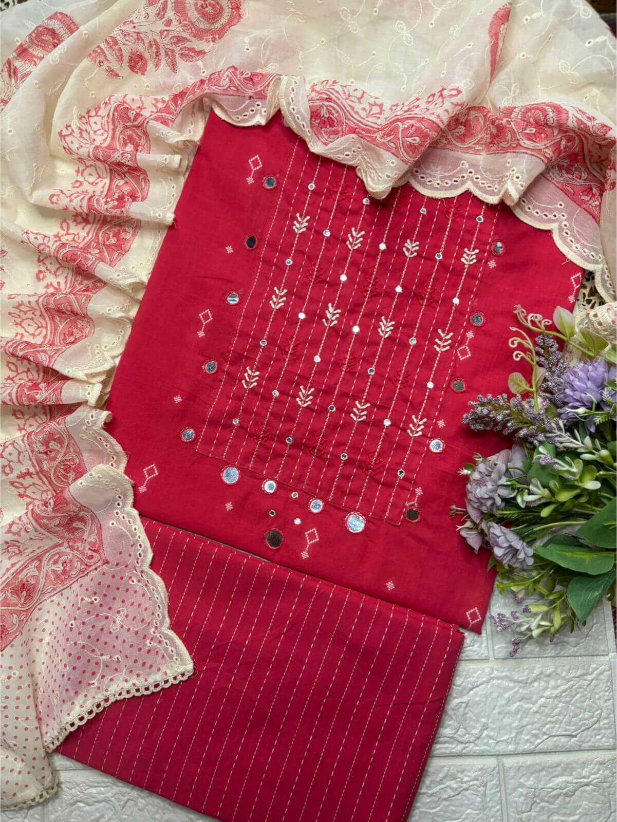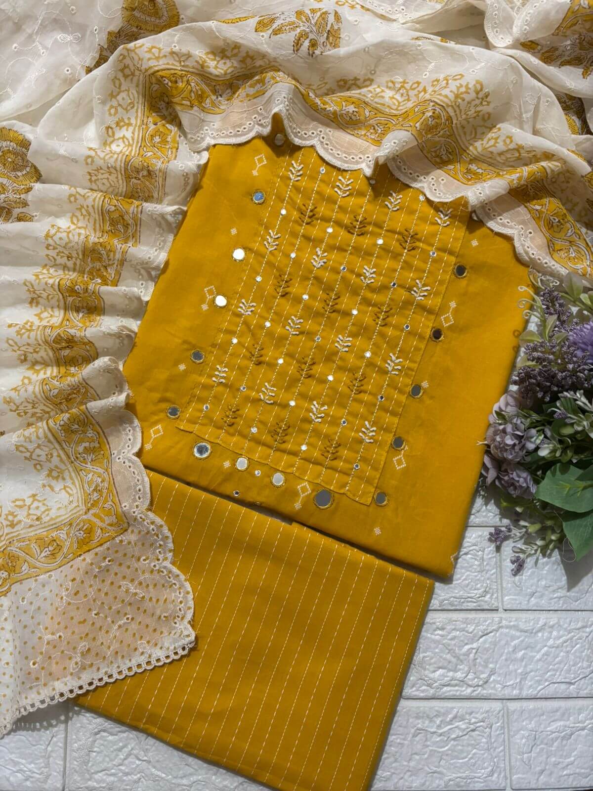 Elegant suit set featuring delicate embroidery with subtle mirror detailing on the neckline, paired with a beautifully scalloped dupatta. Lightweight, graceful, and perfect for festive occasions, small functions, and day-to-evening wear.
