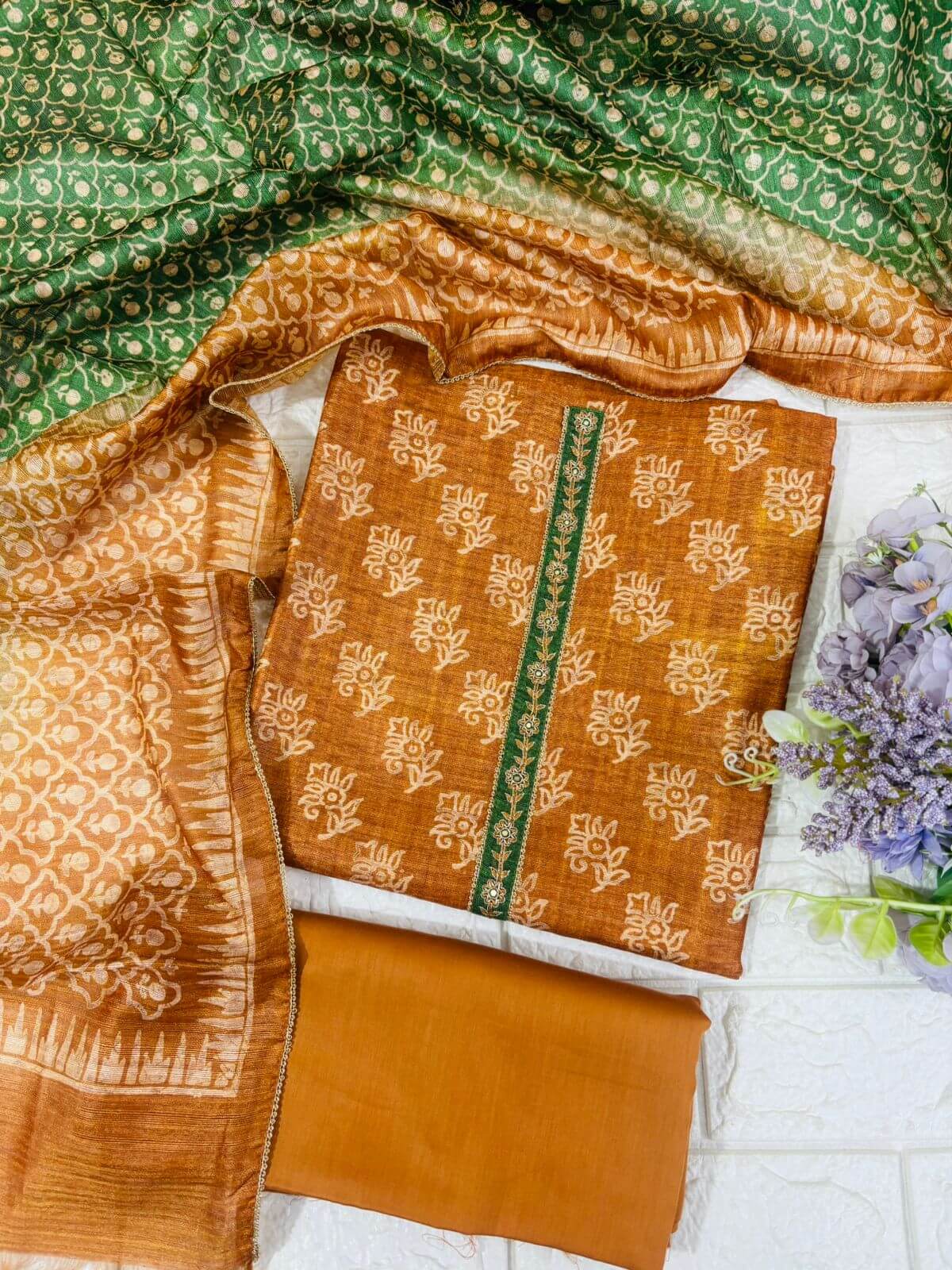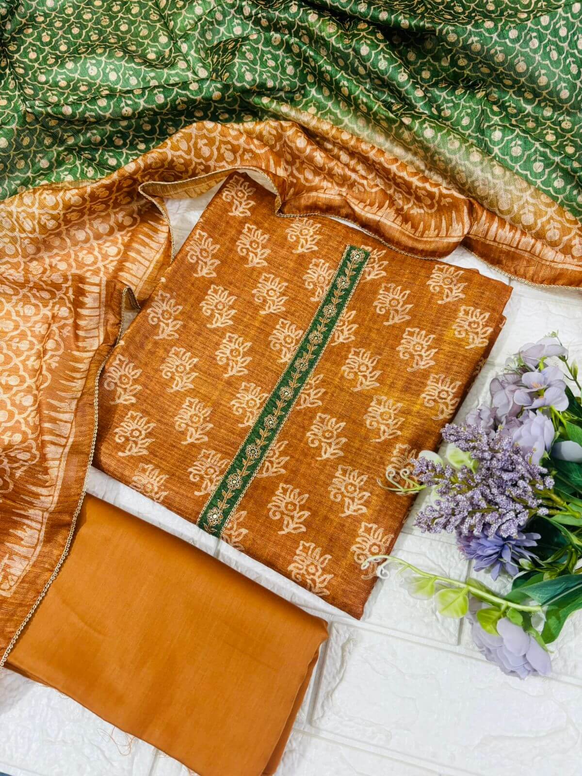 Add a touch of timeless charm to your wardrobe with this elegant mustard suit set. Featuring delicate traditional prints on a soft fabric, the kurta is enhanced with a subtle embroidered neckline for a refined look. Paired with a solid bottom and a beautifully patterned dupatta, this set is perfect for everyday wear, office styling, or light festive occasions—offering comfort with effortless grace.