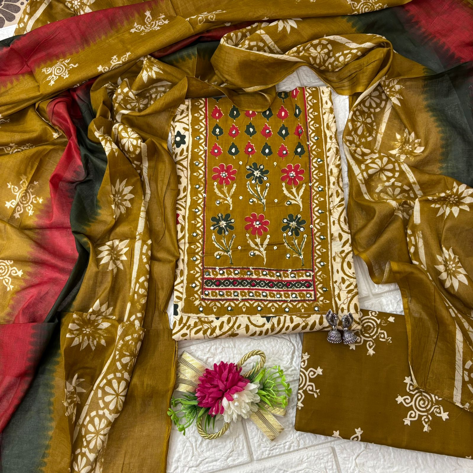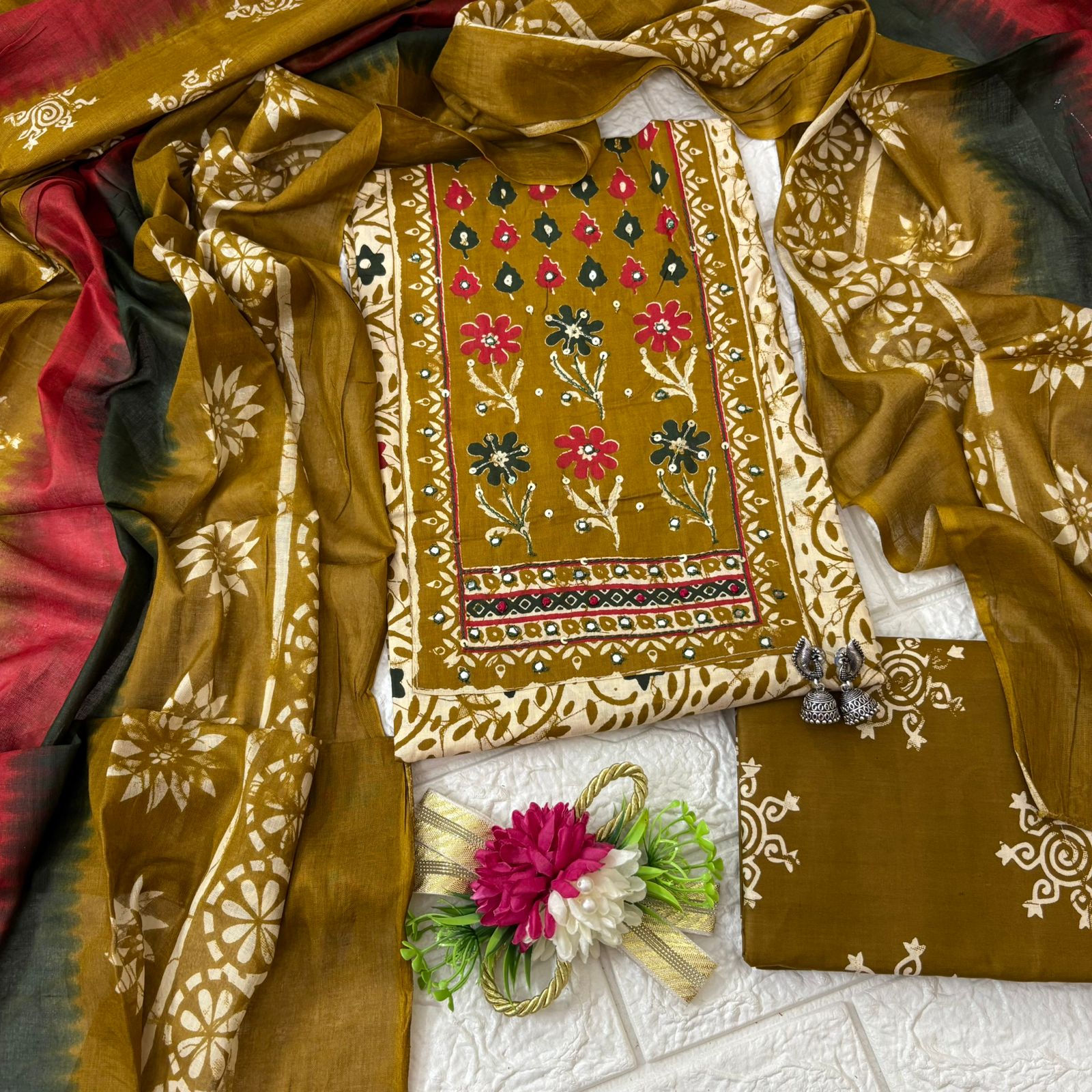 Infuse elegance and tradition into your wardrobe with this 3-piece handblock printed cotton suit set. The mustard yellow kurta features a rich handblock floral design in red, green, and white, beautifully adorned with mirror work accents that add a subtle festive shimmer.
