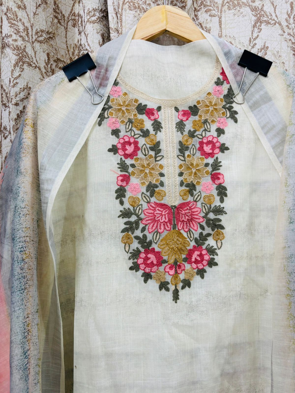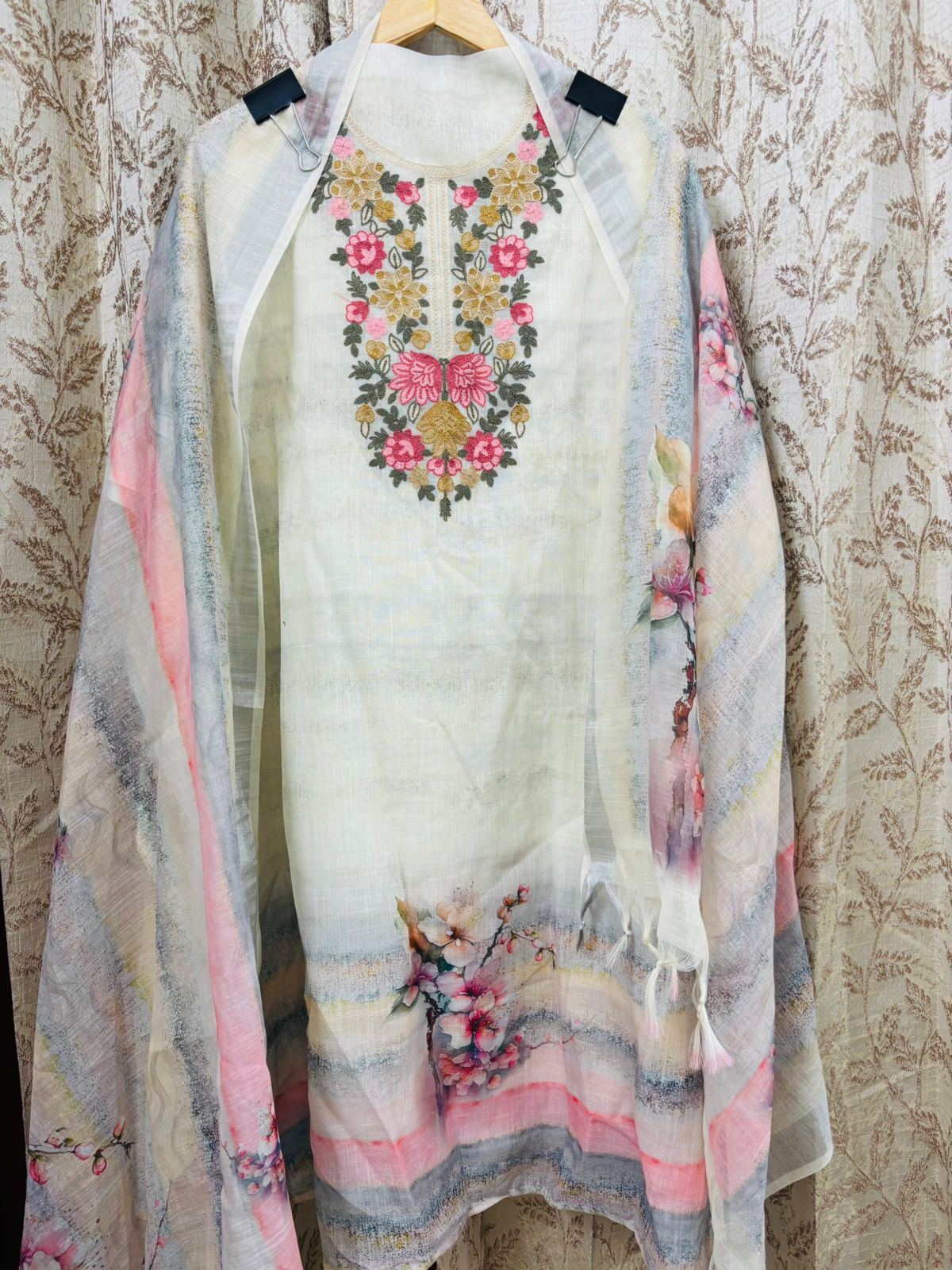 Delicate off-white suit set featuring intricate pink and gold floral embroidery on the neckline. Paired with a soft pastel-printed dupatta, perfect for daytime elegance and festive charm.
