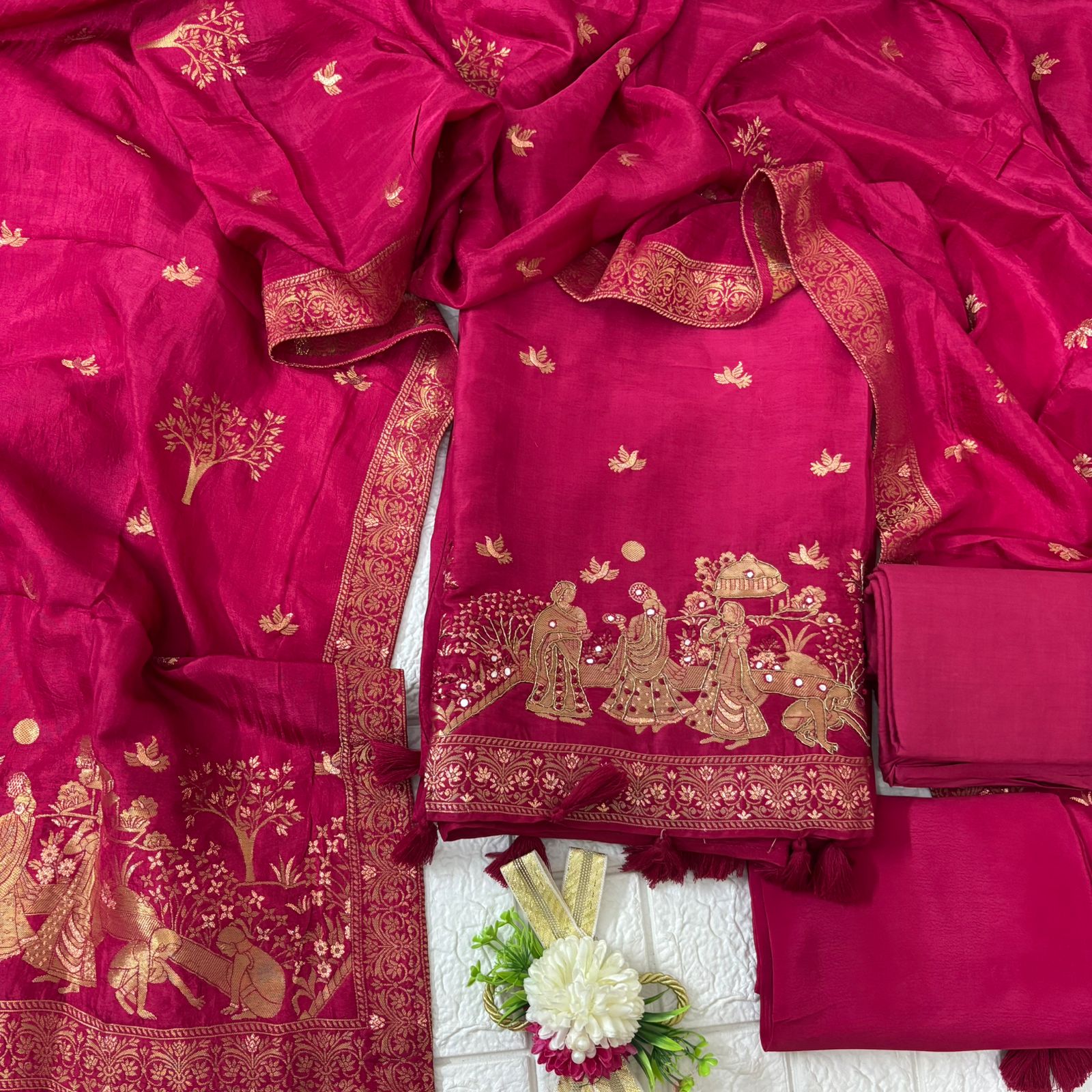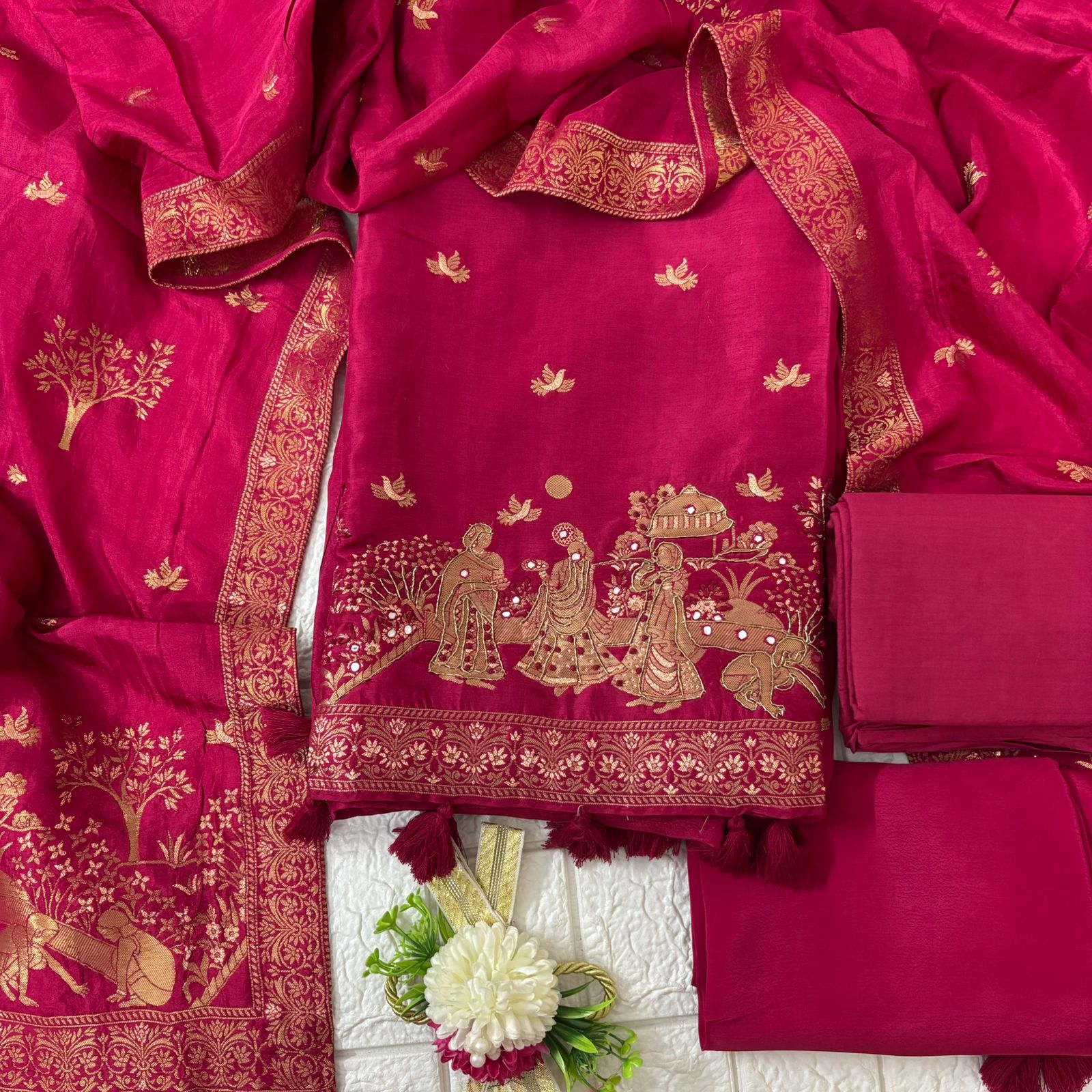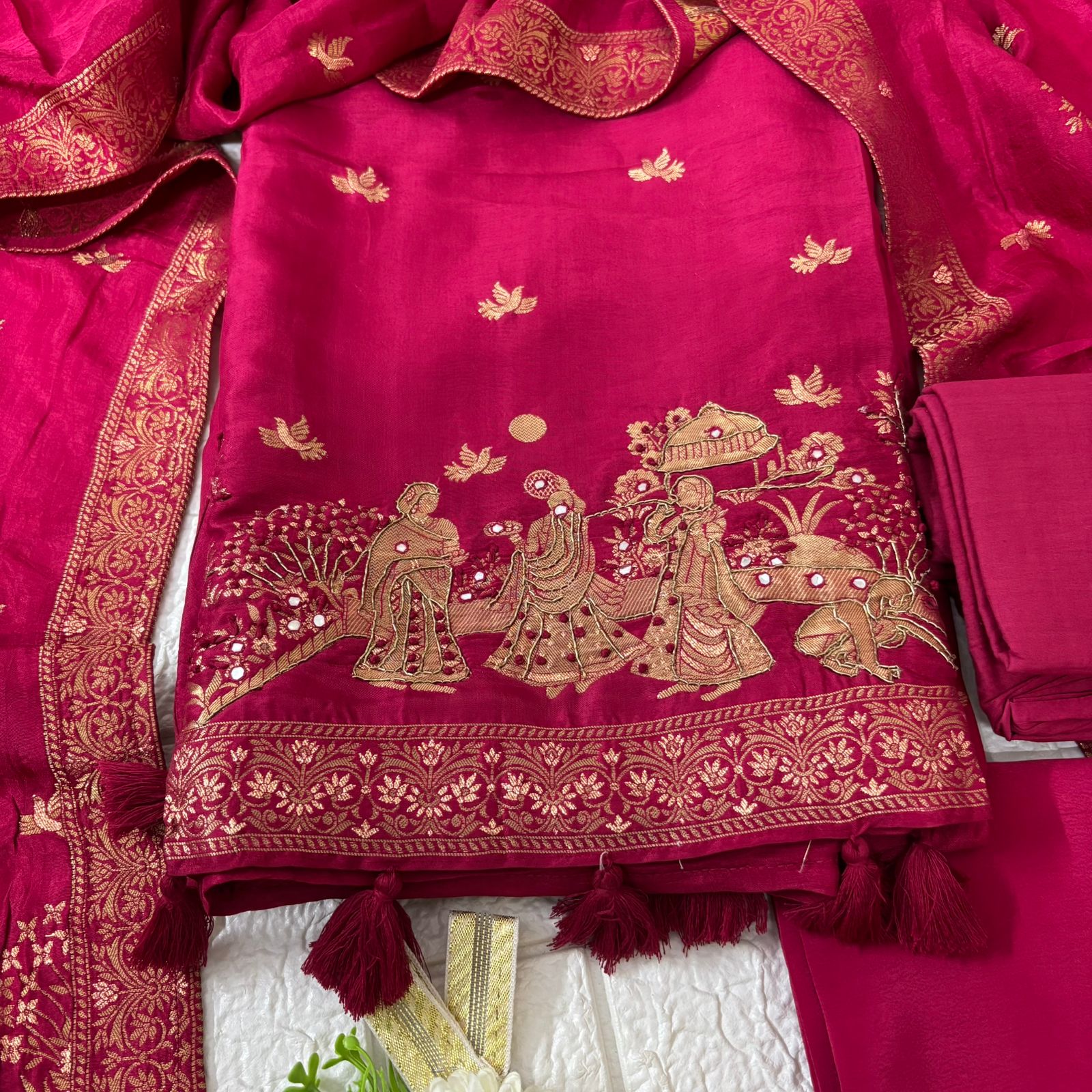 Embrace timeless tradition with this stunning deep magenta fabric set, featuring exquisite hand-embroidered artwork. The dupatta showcases delicate golden embroidery with intricate designs and motifs, adding a royal touch to the backdrop. The shirt piece is beautifully adorned with an elaborate scene of figures in traditional attire, creating a story within the embroidery. The piece is finished with tassels at the hem, enhancing its traditional charm. A matching solid fabric piece completes the set, making it perfect for cultural events, festivals, or special occasions.